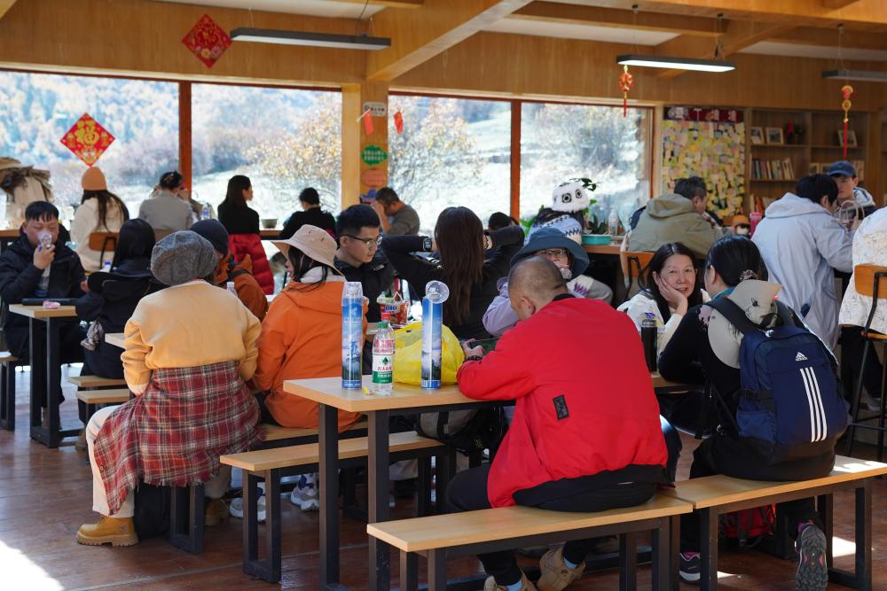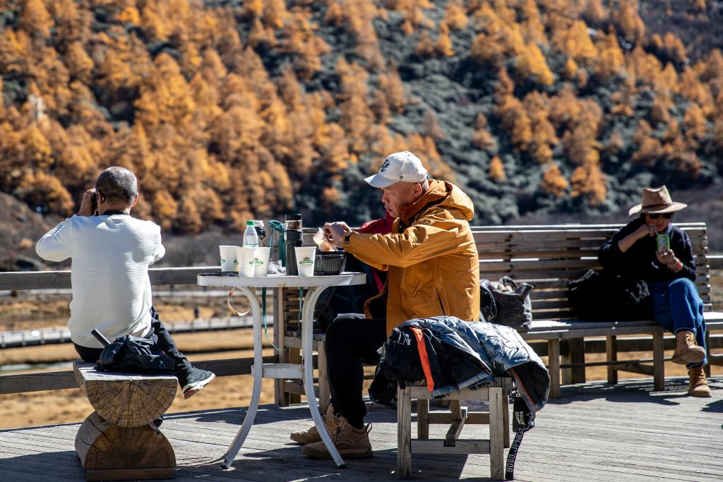 10月31日,在四川省甘孜藏族自治州的稻城亞丁景區(qū),游客在“亞丁驛站”用餐、休息。新華社記者 儲加音 攝
