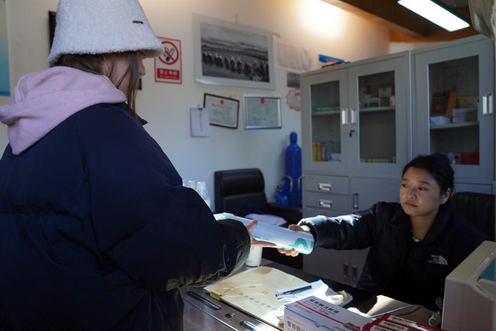 |10月31日,在四川省甘孜藏族自治州稻城亞丁景區(qū)內(nèi)的醫(yī)療服務(wù)站,工作人員(右)為游客提供氧氣瓶。新華社記者 胥冰潔 攝