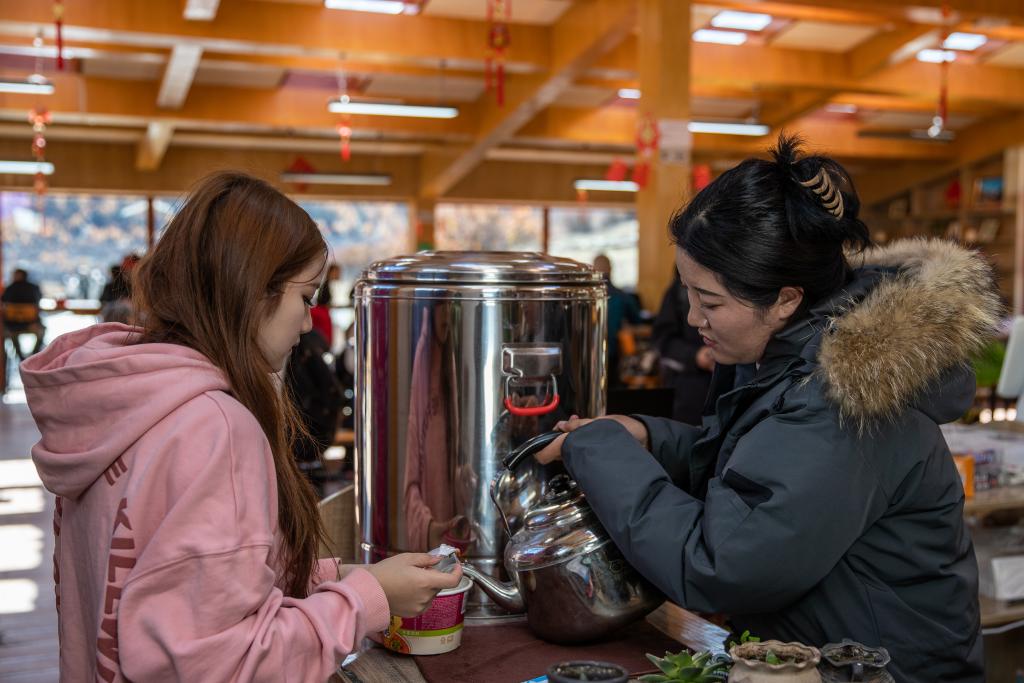 10月31日,在四川省甘孜藏族自治州稻城亞丁景區(qū),工作人員在“亞丁驛站”為游客倒熱水。新華社記者 儲加音 攝