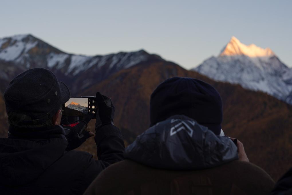 10月31日,游客在四川省甘孜藏族自治州稻城亞丁景區(qū)拍攝日落。新華社記者 胥冰潔 攝