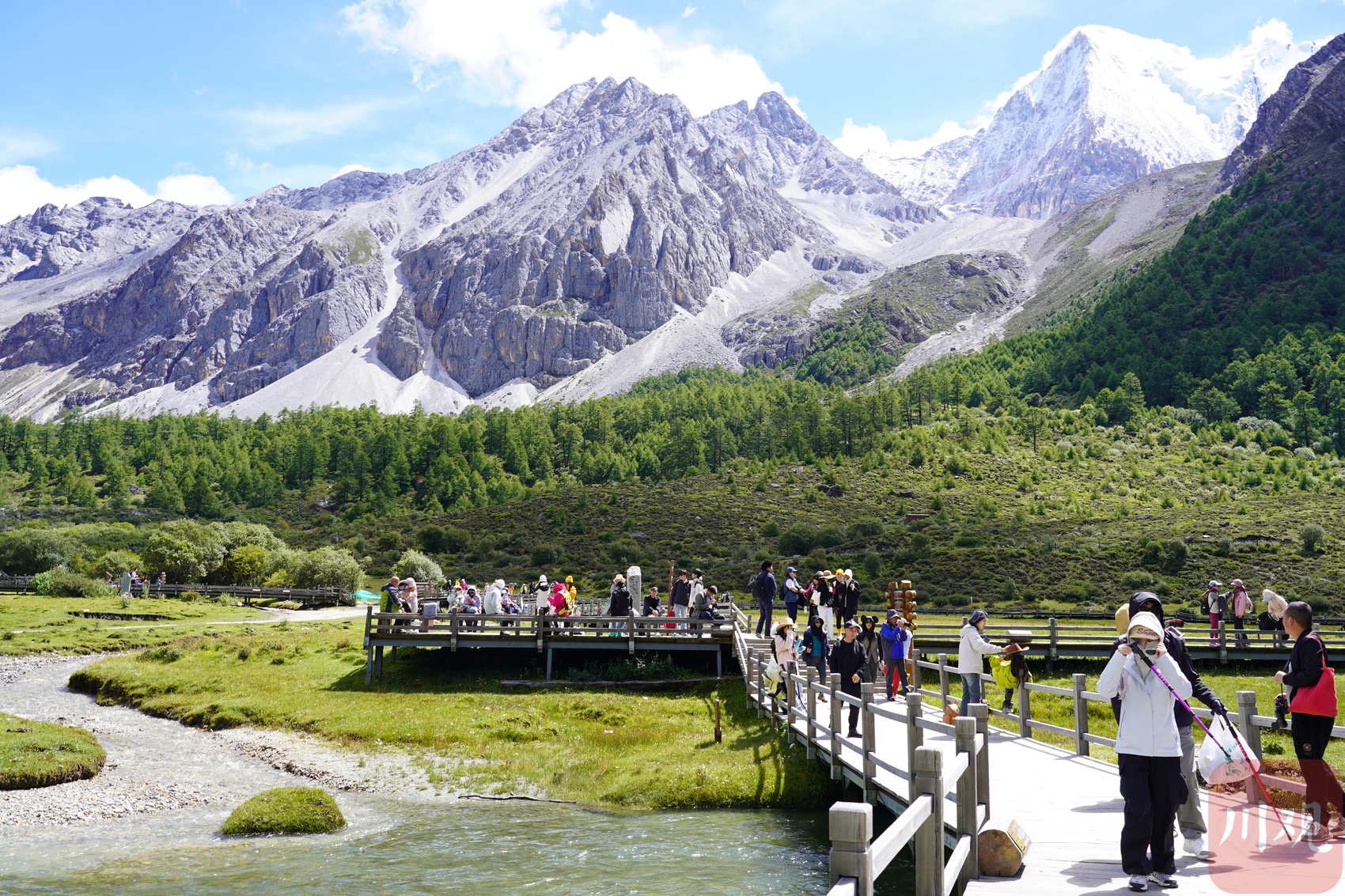 景區(qū)內(nèi)旅游設(shè)施完善,觀光車、步道、觀景臺(tái)、休息站等一應(yīng)俱全。游客們?cè)诠ぷ魅藛T引導(dǎo)下有序參觀游覽,現(xiàn)場(chǎng)秩序井然。雖然還未到金秋時(shí)節(jié),但初秋的亞丁已經(jīng)展現(xiàn)出獨(dú)特的魅力,吸引了不少游客前來(lái)打卡留念。