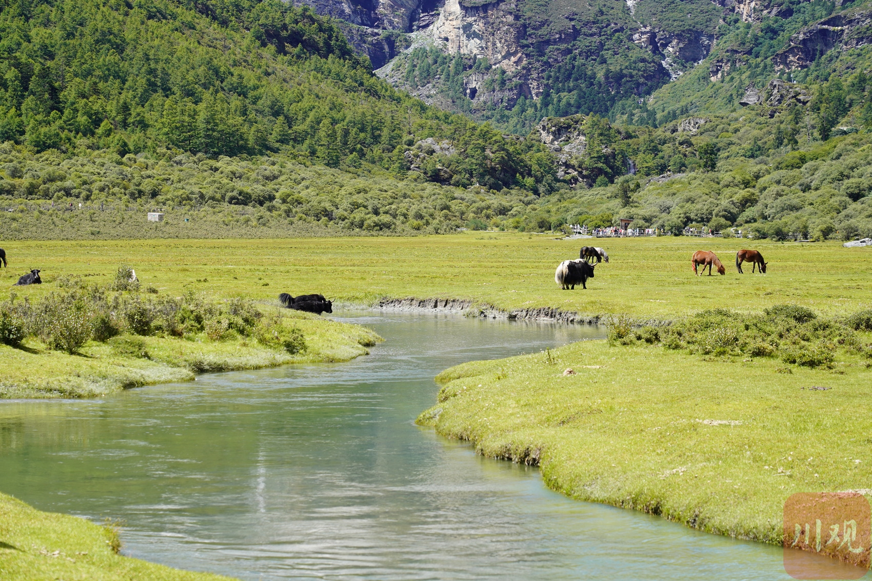洛絨牛場(chǎng)牦牛與河流相映成趣 攝影 張黎萍