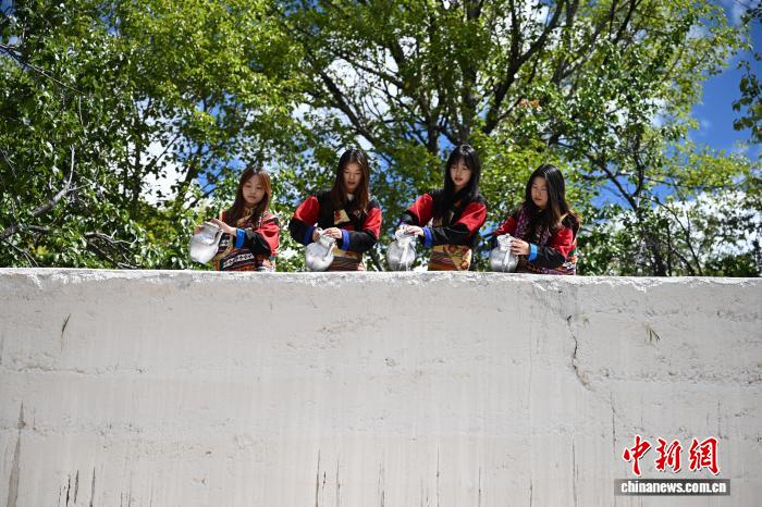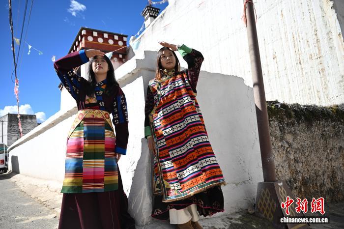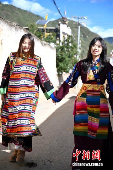 9月21日,四川省甘孜州鄉(xiāng)城縣青德鎮(zhèn),一些游客穿上藏族女性特有的傳統(tǒng)禮服“瘋裝”,在白藏房前體驗“白色灌禮”習俗,感受川西小城鄉(xiāng)城縣獨有的文化魅力。