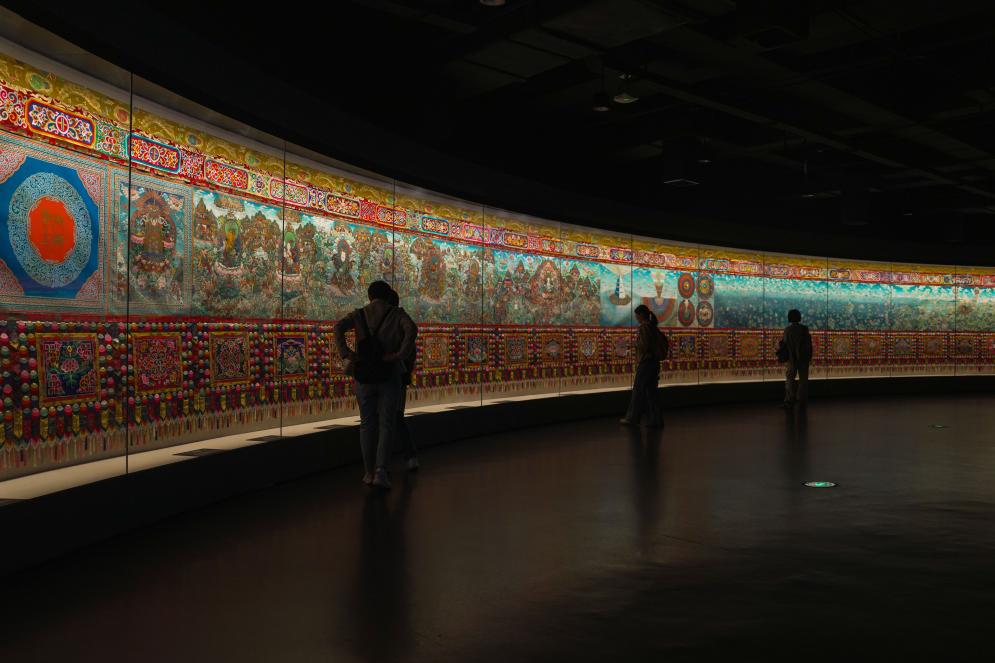 沿著展廳緩緩前行,最令人震撼的莫過于《中國藏族文化藝術(shù)彩繪大觀》。講解員溫得兄停在一幅描繪神話傳說的畫面前介紹:“這幅作品由青、藏、甘、川、滇五省區(qū)400位唐卡畫師共同完成,僅上卷創(chuàng)作就歷時27年?!苯衲?月,全長410米的彩繪大觀下卷布展完成,目前正在博物館北館特展展出。