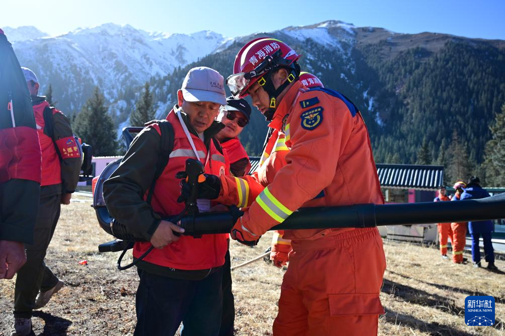 11月8日,在青海省海北藏族自治州祁連縣阿咪東索林區(qū),祁連縣消防救援大隊(duì)消防員(右一)指導(dǎo)當(dāng)?shù)刈o(hù)林員使用森林草原滅火救援裝備。新華社記者 齊芷玥 攝