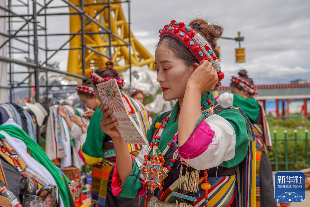 堆諧表演前,格桑卓瑪在后臺整理妝容(8月4日攝)。