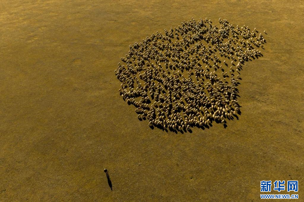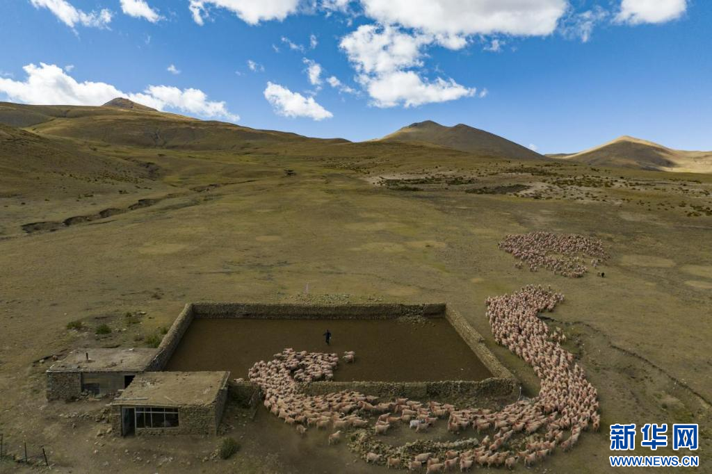 扎西松多村集體養(yǎng)殖的千只綿羊(無人機照片)。新華網 旦增努布 攝