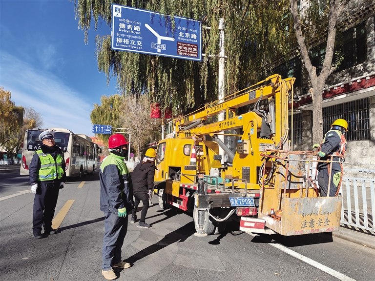 “結(jié)合拉薩市城鄉(xiāng)環(huán)境綜合大整治,我們在開展道路交通整治行動中,積極聯(lián)合園林部門對于道路兩旁樹枝遮擋交通信號燈、指示標(biāo)牌和電子監(jiān)控探頭等問題進(jìn)行全方位整改,此次整改點位155處,確保轄區(qū)道路交通安全暢通。在此,提醒廣大交通參與者,遇到修剪樹枝車輛,請減速慢行,確保交通安全?!崩_市公安局交警支隊城南大隊副大隊長張浩表示。