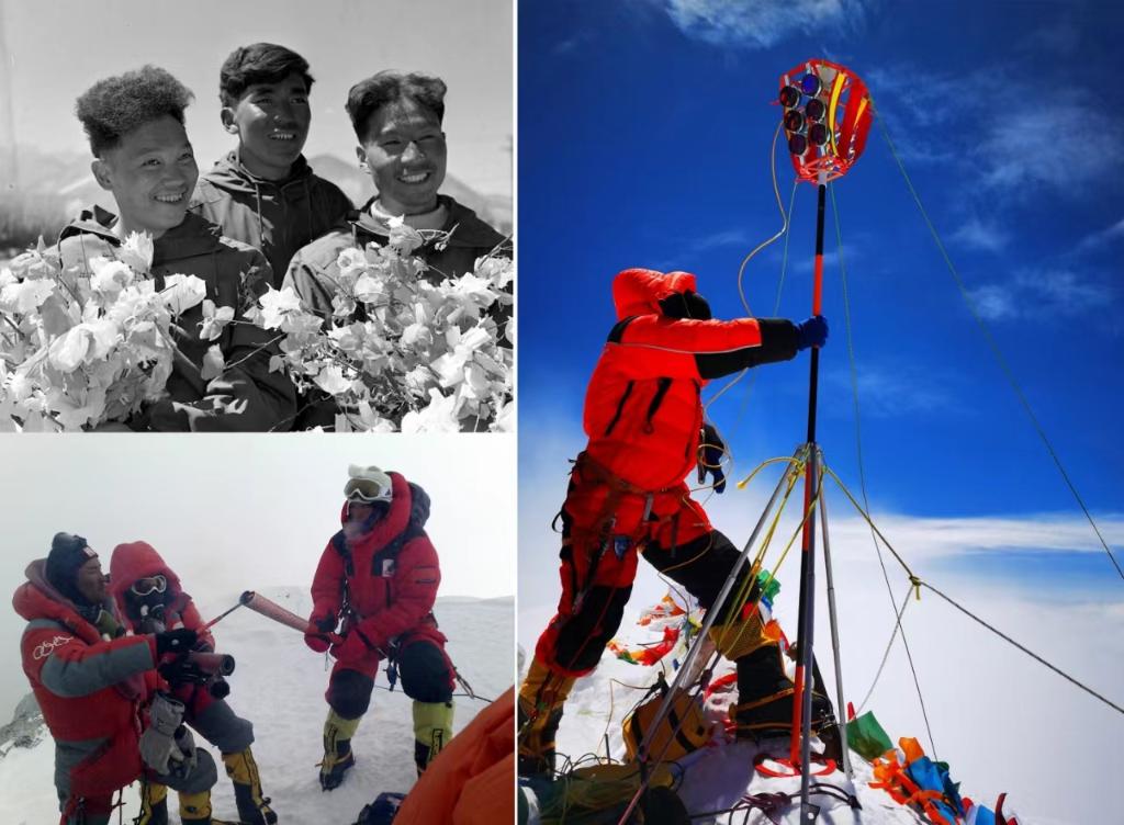 拼版照片:左上圖為1960年5月登上珠穆朗瑪峰峰頂?shù)闹袊巧疥?duì)隊(duì)員王富洲(右)、貢布(中)和屈銀華(資料照片,新華社發(fā));左下圖為2008年5月8日,北京奧運(yùn)圣火珠峰傳遞登山隊(duì)隊(duì)員羅布占堆(左)點(diǎn)燃第一棒火炬手吉吉手中的“祥云”火炬(新華社發(fā));右圖為2020珠峰高程測(cè)量登山隊(duì)隊(duì)員在珠穆朗瑪峰峰頂開展測(cè)量工作(2020年5月27日新華社特約記者扎西次仁攝)