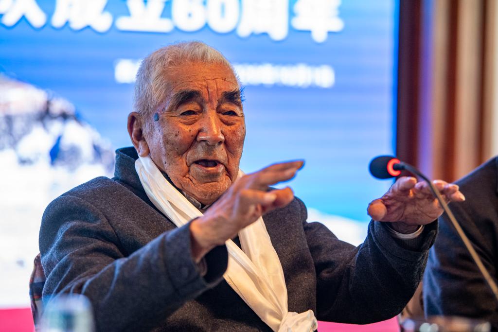 2020年10月1日,87歲高齡的老登山家貢布在慶祝中國西藏登山隊(duì)成立60周年活動(dòng)上致辭。新華社記者 孫非 攝