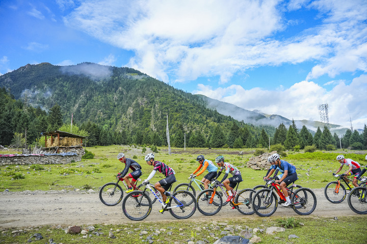 圖為2023年環(huán)巴松措山地自行車越野競速賽比賽現(xiàn)場(chǎng)