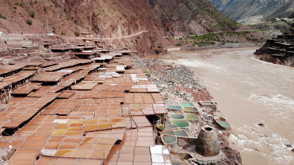 鹽田在瀾滄江兩岸依山而建,由多根木柱搭架,架上用透水性強(qiáng)的泥土鋪成平面夯實(shí)。