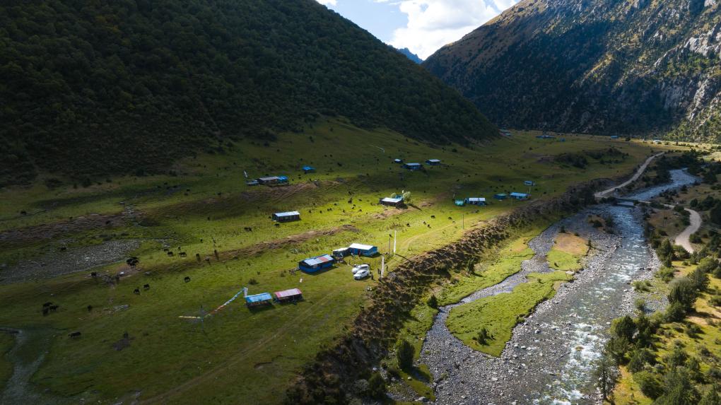 貢喬熱旦家夏季牧場的全貌(無人機照片,9月4日攝)。新華社記者 丁增尼達 攝