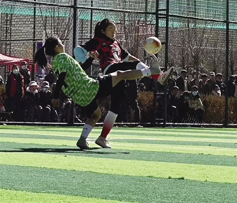 而最能證明她們訓(xùn)練成果的就是足球聯(lián)賽。 2023年“迎新杯”酷銳運動拉薩業(yè)余足球5人制(女子組)比賽、第二屆“亞克杯”女子5人制交流賽在拉薩開賽,這也是西藏少有的女足賽事。米央以拉薩另類女子足球隊隊員身份參賽,盡管米央是隊內(nèi)年紀(jì)最小的成員,但她的能力絲毫不遜于任何人。米央所在的這支由高中生、大學(xué)生等組成的隊伍,經(jīng)過10場比賽,拼盡全力最終奪得冠軍?!懊慨?dāng)足球在我腳下滾動飛躍,每當(dāng)我奔跑在綠茵場上,那種肆意和快樂讓我堅定我的選擇,我的夢想是踢進(jìn)中國國家女子足球隊?!泵籽胝f。雖然她與夢想還有距離,但內(nèi)心那股熊熊燃燒的信念力量,成為她刻苦訓(xùn)練的“定心丸”。