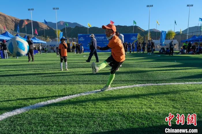 足球運動在拉薩擁有廣泛的基礎,圖為10月26日下午,一群孩子在2024拉薩“村超”足球聯(lián)賽現(xiàn)場練習射門。中新社記者 江飛波 攝