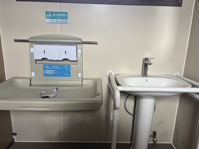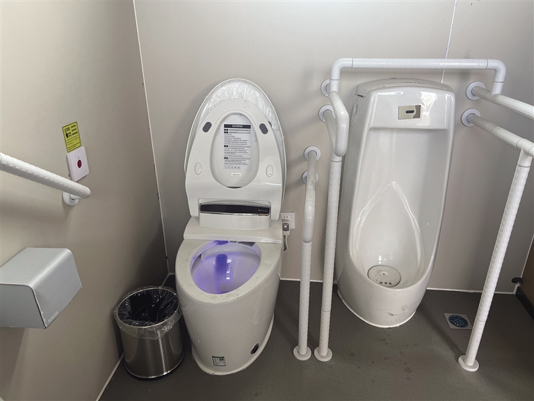 公廁內(nèi)部除了正常的蹲位,還設(shè)有第三衛(wèi)生間。第三衛(wèi)生間內(nèi)配有嬰兒護理臺、嬰兒安全座椅等設(shè)施。除此之外,第三衛(wèi)生間還設(shè)有安全扶手、智能馬桶等設(shè)備,方便腿腳不方便的老年人及殘疾人。智能馬桶旁還安裝有緊急報警器?!叭绻欣先嗽趲梗涂梢园匆幌戮o急報警器。這也是我們考慮到殘疾人、老年人如廁不方便,增設(shè)的人性化設(shè)計?!背嗔姓f。