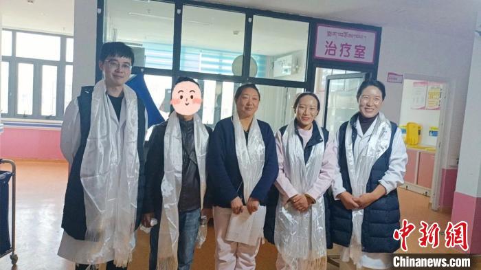 患者家屬向程偉業(yè)(左一)與醫(yī)護敬獻哈達。浙江省人民醫(yī)院供圖