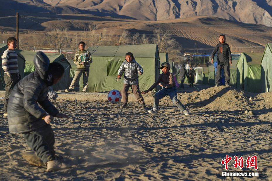 西藏定日縣震后第四天 夕陽(yáng)下孩子踢球暖人心