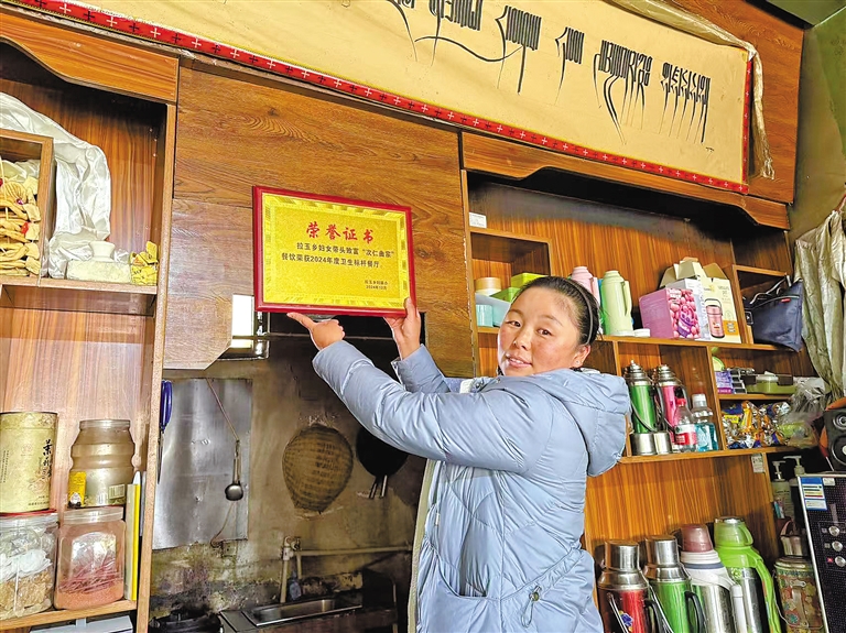圖為次仁曲宗在門店懸掛“衛(wèi)生標桿”獎牌。記者 孫開遠 索朗曲珍 攝