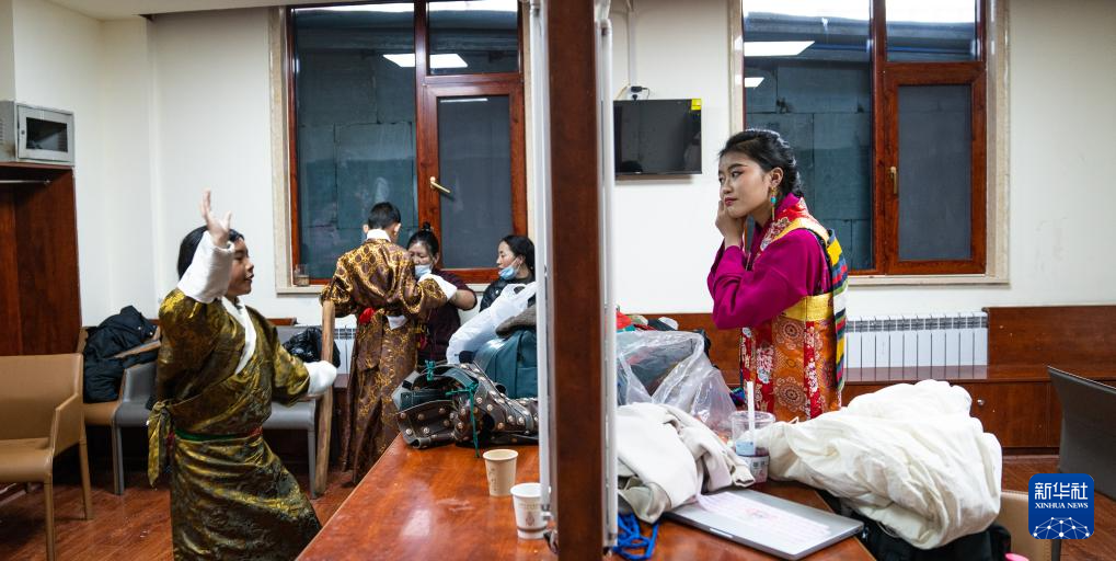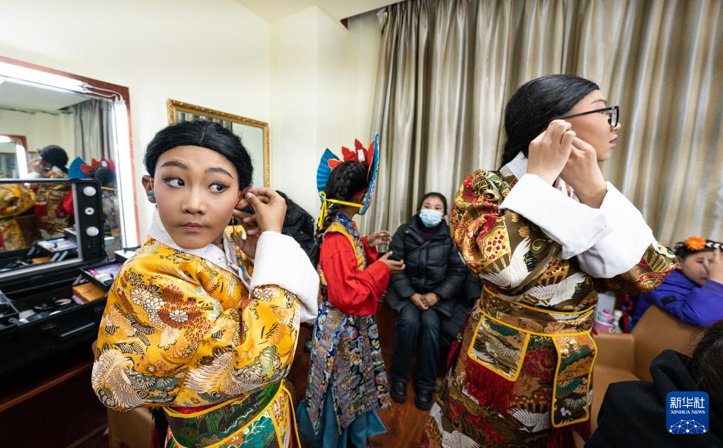 小演員在準備演出舞臺劇藏戲《頓月頓珠》(2月11日攝)。新華社記者 丁增尼達 攝
