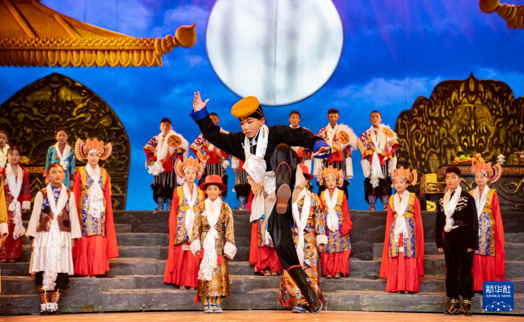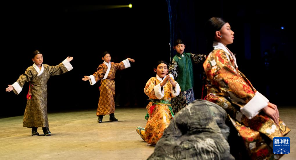 這是西藏首部少兒舞臺劇藏戲《頓月頓珠》演出現(xiàn)場,羅桑朗覺(右三)在劇中飾演“頓月”(2月11日攝)。新華社記者 丁增尼達 攝