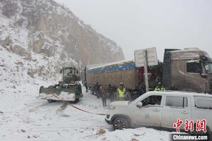 據(jù)了解,災(zāi)情發(fā)生后,擔(dān)負(fù)該路段養(yǎng)護(hù)保通任務(wù)的武警第二機(jī)動總隊某支隊官兵迅速啟動道路除雪保通預(yù)案,抽組專業(yè)救援力量及大型救援裝備趕赴受阻路段實施搶通。受阻路段平均海拔處于4000米以上,持續(xù)降雪不斷,官兵們首先對滯留人員進(jìn)行安撫,并發(fā)放食物和藥品等救援物資,為盡快清理路面積雪,官兵采取“機(jī)械協(xié)同先通后擴(kuò)、人機(jī)配合高效救援”的方式同步展開作業(yè)。期間,一輛重載半掛車不慎陷入邊溝中,指揮員果斷調(diào)整方案,封控現(xiàn)場、撒布融雪劑、清理四周積雪、鋼絲繩牽引等步驟緊張有序的進(jìn)行中……伴隨著發(fā)動機(jī)的轟鳴聲,車輛被成功救出。