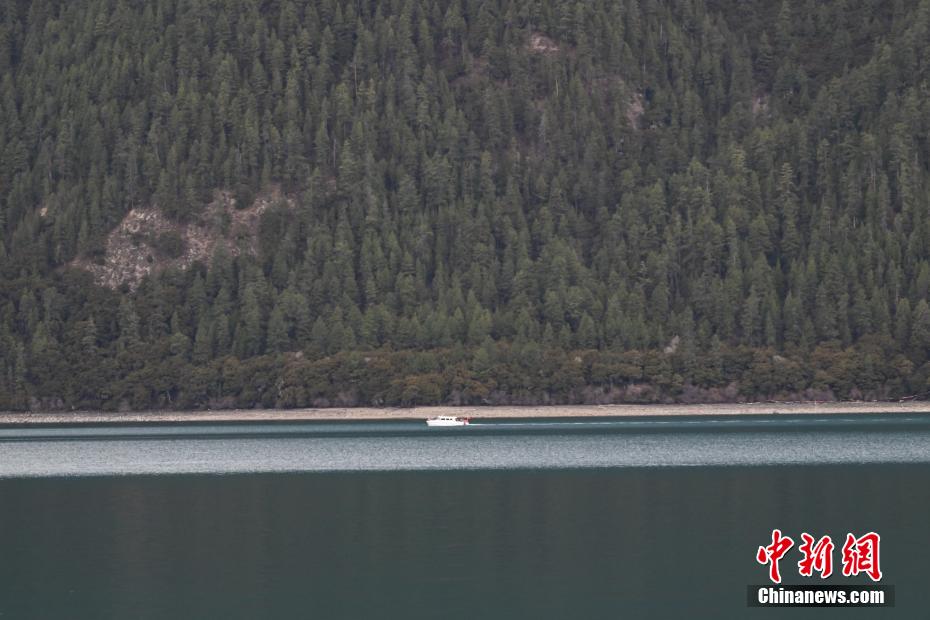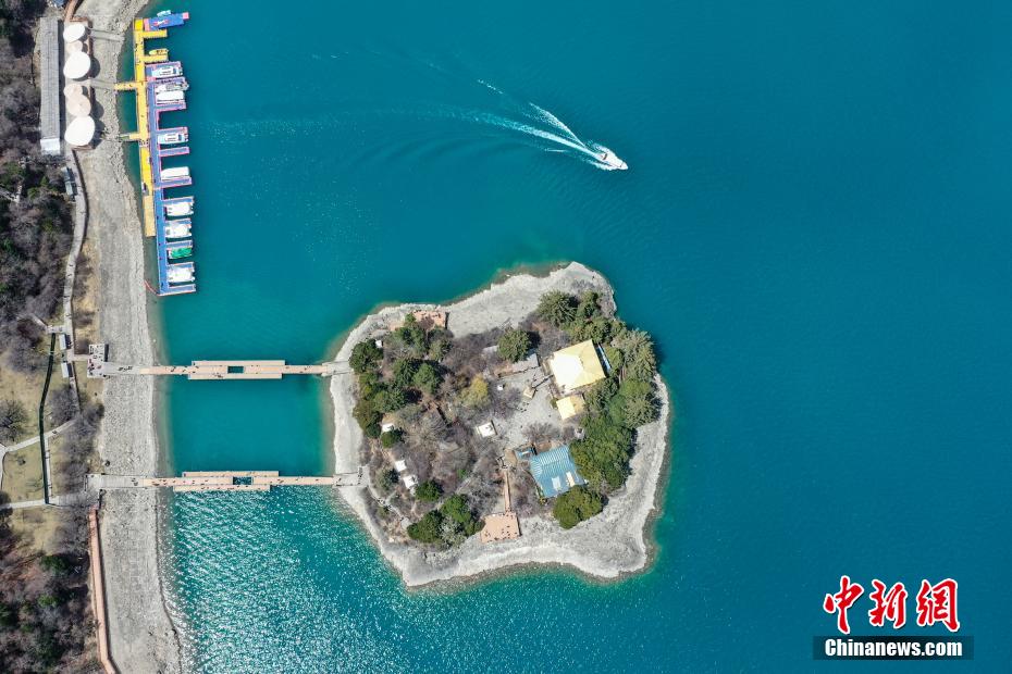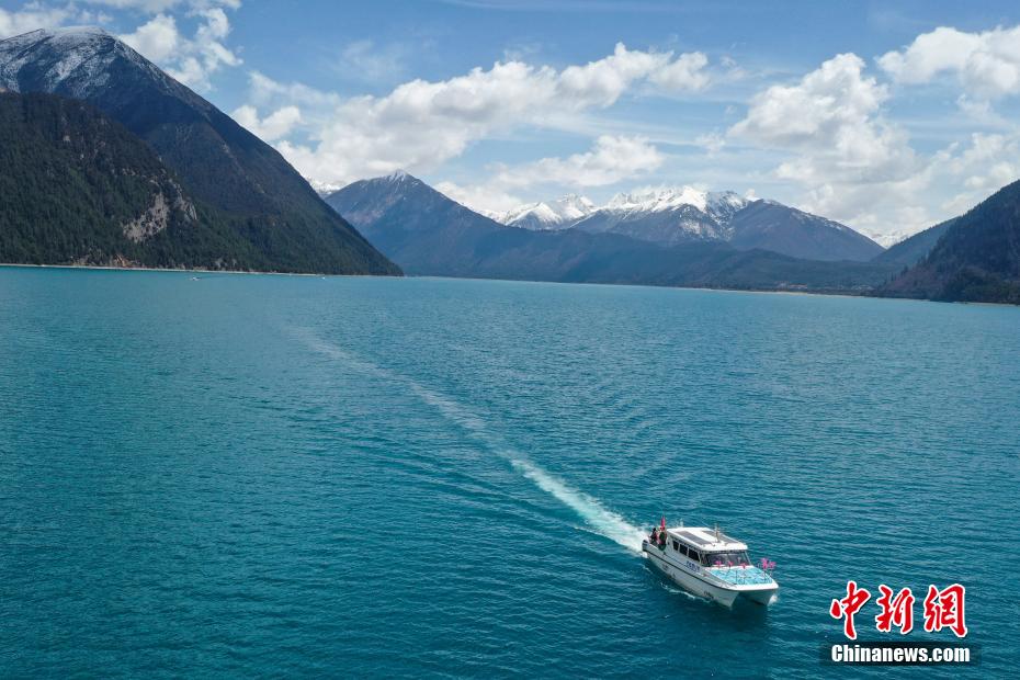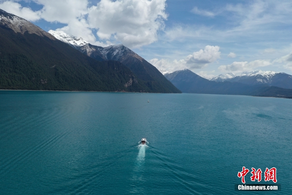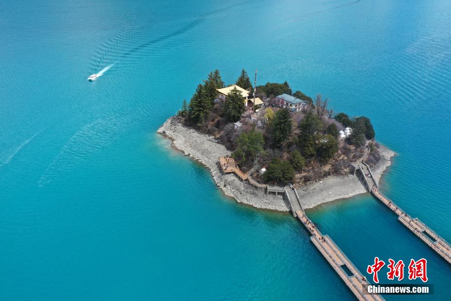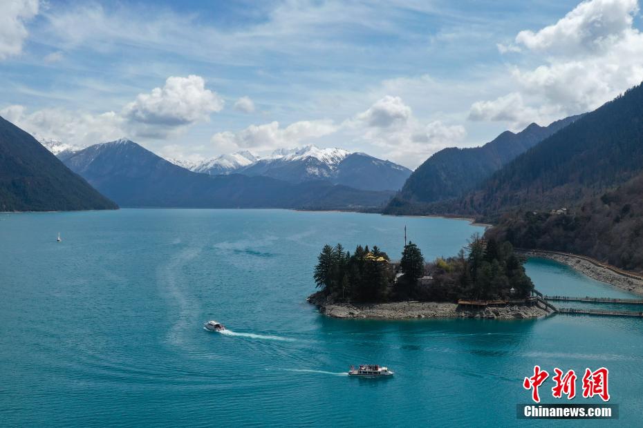 4月6日,西藏林芝工布江達縣巴松措景區(qū)游人如織。春日里,湛藍湖水與巍峨雪山相映成趣,游客游玩湖心島或乘船游覽,沉醉在這湖光山色中。圖為巴松措里的游船。(無人機照片)中新社記者 貢嘎來松 攝