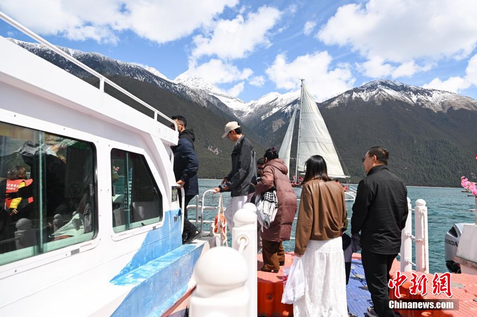 4月6日,西藏林芝工布江達縣巴松措景區(qū)游人如織。春日里,湛藍湖水與巍峨雪山相映成趣,游客游玩湖心島或乘船游覽,沉醉在這湖光山色中。圖為游客準(zhǔn)備乘船游覽巴松措。中新社記者 貢嘎來松 攝