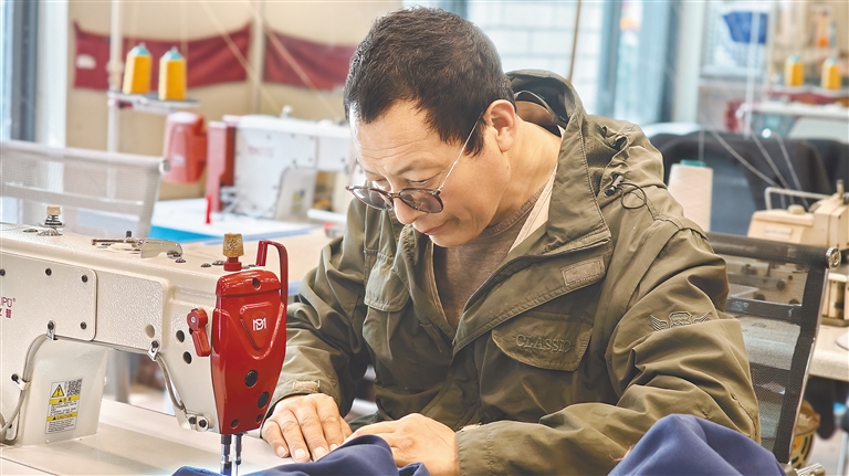 圖為自治區(qū)級非遺傳承人、雪堆白技工學(xué)校噠啦服飾工作室老師洛桑麥朗在制作藏裝。