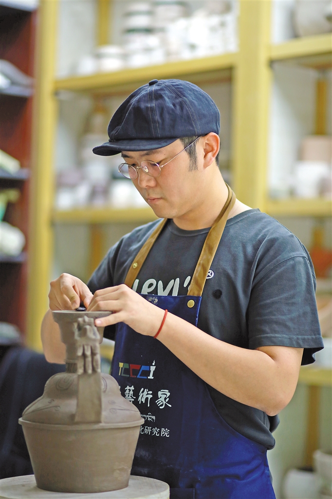 圖為雪堆白技工學(xué)校陶瓷工作室老師王竹在進(jìn)行藏式器皿的設(shè)計(jì)與制作。