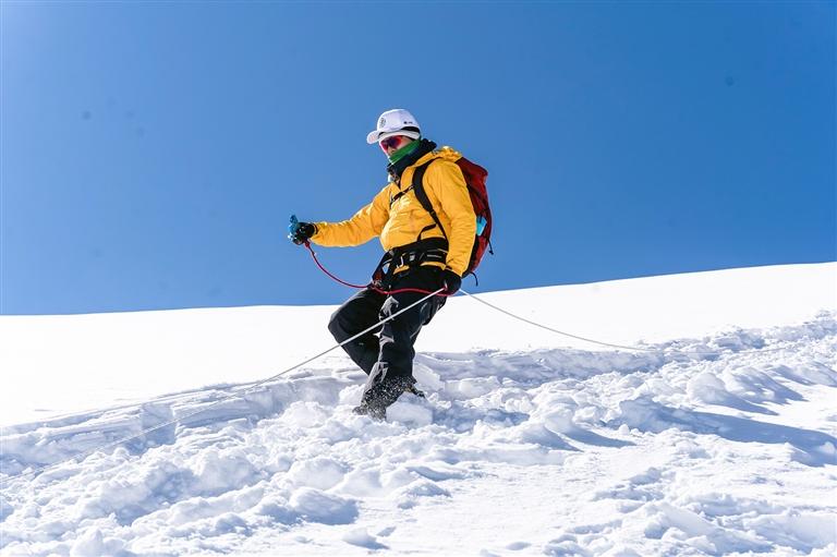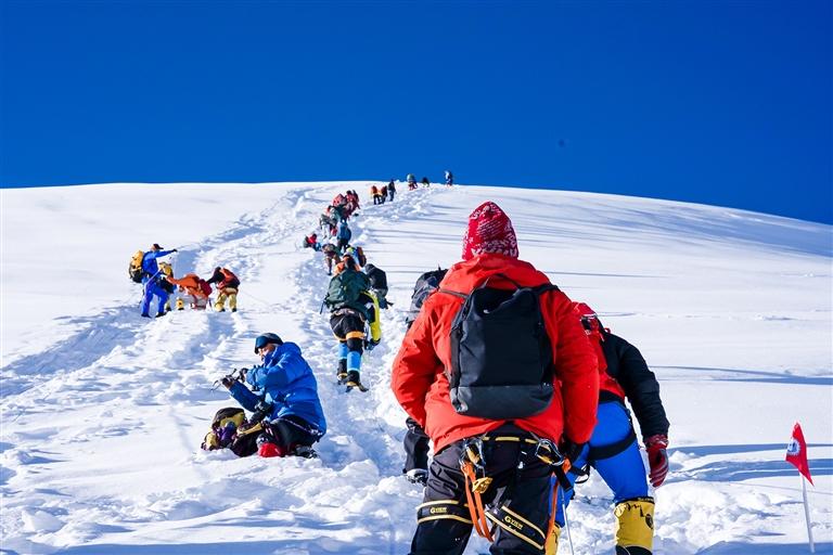 登頂?shù)哪且豢?,喜悅之情洋溢在每個(gè)人的臉上,大家紛紛開始拍照留念。第三次登頂?shù)纳接鸭玻y掩激動(dòng)地向記者分享了此次難忘的攀登經(jīng)歷。她提到,在沖頂前一日,教練提醒所有人,因近期頻繁降雪,加之粉雪的特性,今年的攀登路線難度大幅提升。盡管如此,這絲毫沒有削減她的熱情,反而讓她對3日的登頂充滿了期待。