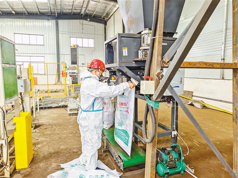 圖為在措美縣哲古社區(qū)有機肥加工廠,工人正把調配好的有機肥裝袋。通訊員 王利軍 攝
