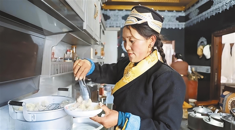 圖為朗縣拉丁雪村村民堅阿措姆在嶄新的廚房里忙著盛裝熱氣騰騰的牛肉包子。記者 謝筱純 攝