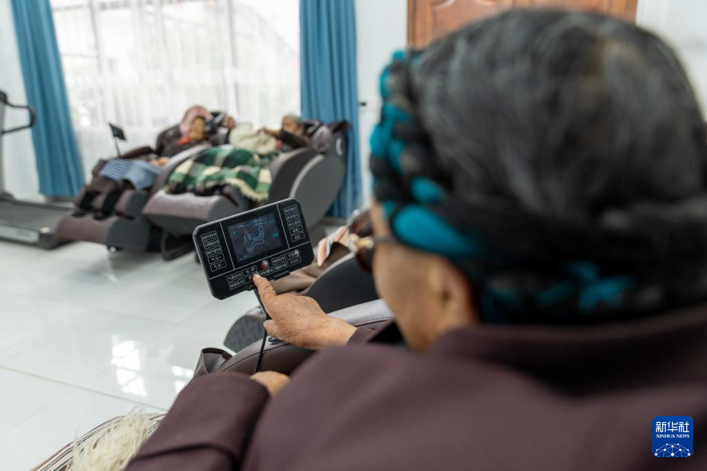 7月17日,老人們?cè)谌写逍腋sA站日間照料室的按摩椅上享受按摩。新華社記者 旦增尼瑪曲珠 攝