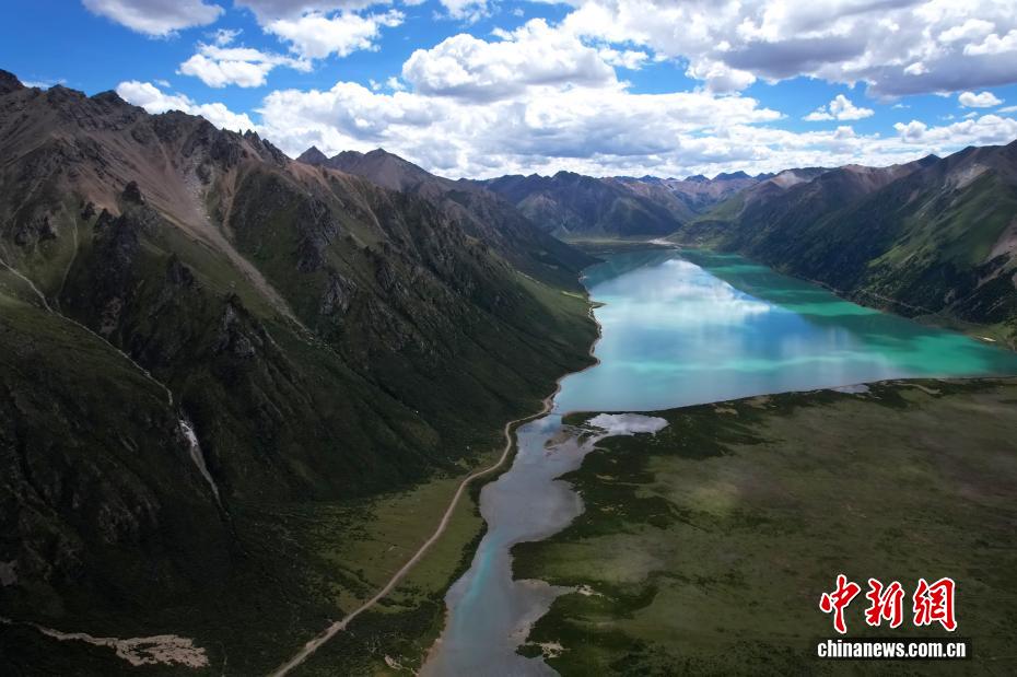 7月21日,嘉乃玉錯景色。嘉乃玉錯國家濕地公園位于西藏那曲市嘉黎縣境內(nèi)。夏日,嘉乃玉錯碧波蕩漾,湖邊綠意盎然,在藍(lán)天白云映襯下,景色如畫。(無人機(jī)照片)中新社記者 李林 攝
