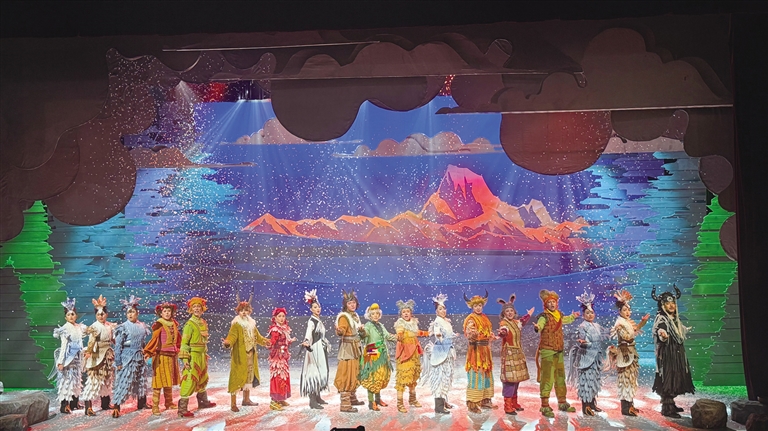 在《高原上的精靈》舞臺(tái)上,西藏傳統(tǒng)樂器的韻律與生態(tài)寓言相互交織。當(dāng)弦子、鷹笛和扎念琴的聲音劃破夜空時(shí),小觀眾們已沉浸其中。藏戲溫巴的藍(lán)面具在聚光燈下浮現(xiàn),藏戲特有的說唱調(diào)式如雪山融水般流淌……《高原上的精靈》以80分鐘的音樂劇形式突破傳統(tǒng)話劇的敘事框架,這種形式選擇源于深刻的兒童心理洞察——音樂劇特有的歌舞敘事能持續(xù)刺激視覺與聽覺神經(jīng),避免低齡觀眾對(duì)純對(duì)白場(chǎng)景產(chǎn)生倦怠感。