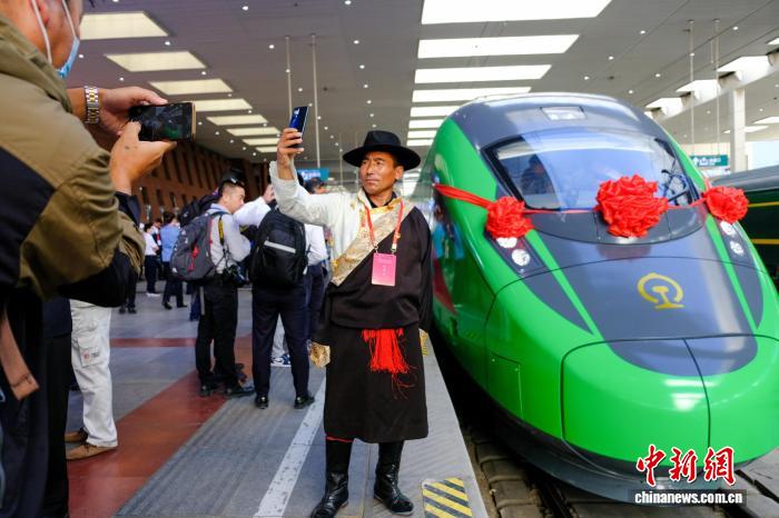 資料圖為2021年6月25日,西藏拉林鐵路開通運營,民眾在拉薩火車站與復(fù)興號拍照留念。當日,斯朗旺扎系首發(fā)司機。中新網(wǎng)記者 江飛波 攝