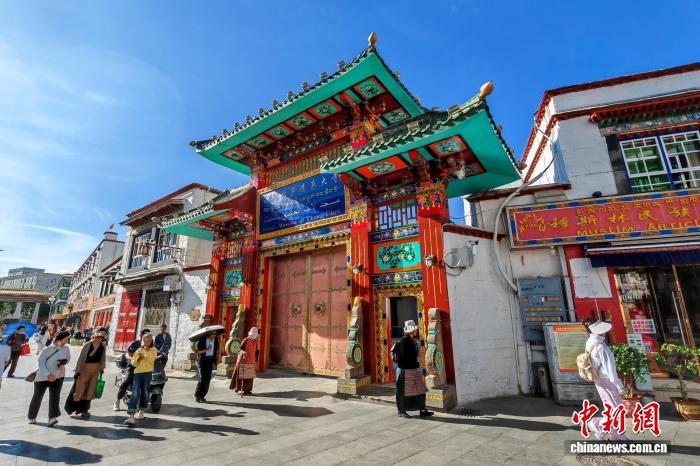 8月1日,藍天下,拉薩清真大寺的大門體現(xiàn)出斗拱結(jié)構(gòu)和藏式涂裝風格的結(jié)合。中新社記者 江飛波 攝