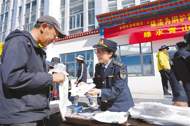 在法規(guī)宣講環(huán)節(jié),工作人員通過設立宣傳展板、懸掛宣傳橫幅、發(fā)放政策法規(guī)手冊、現場接受群眾咨詢答疑等形式,向群眾集中宣傳《中華人民共和國青藏高原生態(tài)保護法》及自治區(qū)實施辦法等生態(tài)環(huán)保法律法規(guī)。