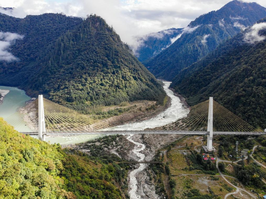 2019年10月27日拍攝的川藏公路通麥路段上的迫龍溝特大橋。 新華社記者 孫非 攝