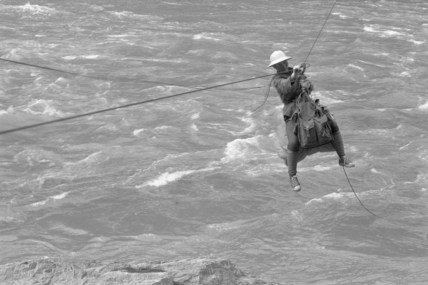 1983年,西藏林業(yè)局考察隊(duì)員通過(guò)雅魯藏布江上的溜索過(guò)江。新華社記者 土登 攝