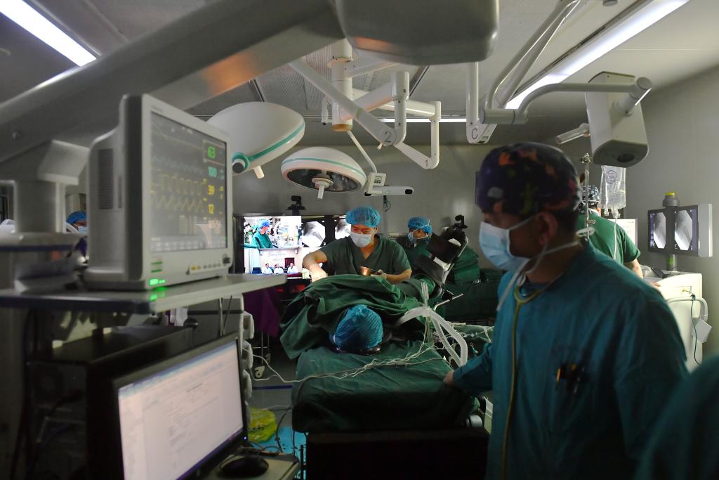 2021年4月19日,拉薩市人民醫(yī)院骨科醫(yī)生在北京積水潭醫(yī)院專家遠(yuǎn)程指導(dǎo)下使用骨科機(jī)器人開(kāi)展骨科手術(shù)。 新華社記者 孫瑞博 攝