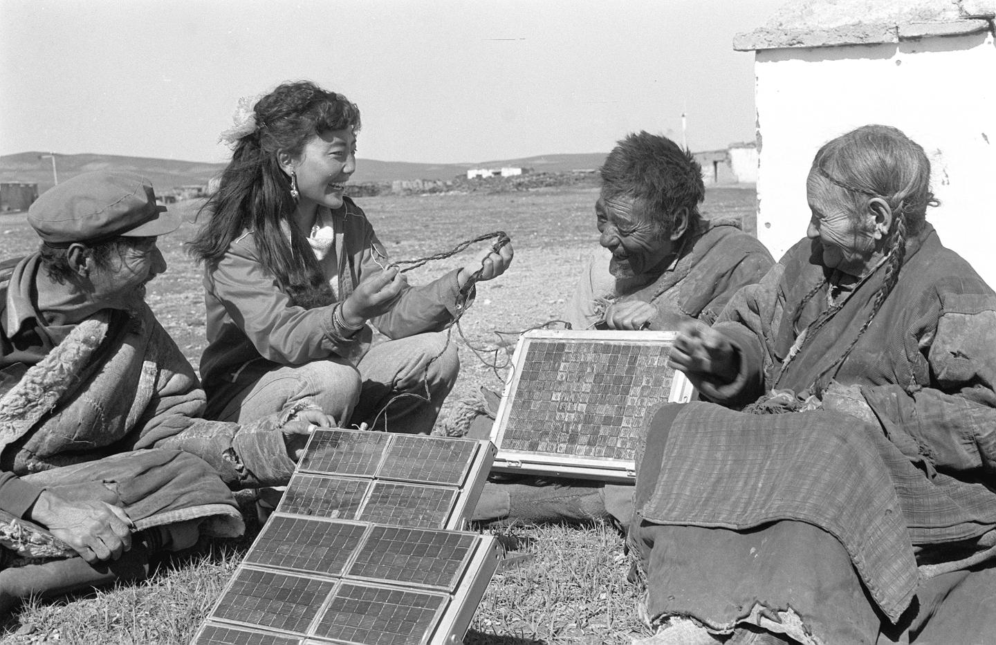 1986年3月,那曲地區(qū)(現(xiàn)為那曲市)科委工作人員齊美才央(左二)給牧民講解太陽(yáng)能電池使用方法。新華社記者 才龍 攝