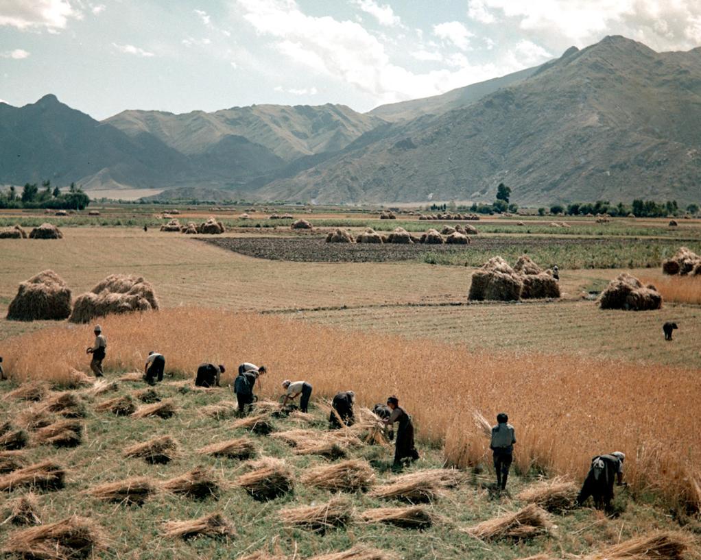1965年,堆龍德慶縣(現(xiàn)為堆龍德慶區(qū))南崗鄉(xiāng)互助組組員們?cè)谑崭钋f稼。新華社記者 吳祖政 攝