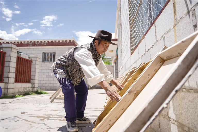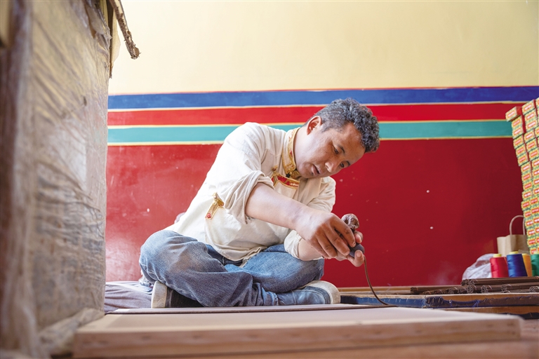 8月13日,記者來(lái)到尼木縣普松鄉(xiāng)曲水村的一個(gè)院落,58歲的斯曲正在窗邊埋頭雕刻,刻刀飛轉(zhuǎn)游走間,精致的花紋在木板上慢慢展現(xiàn),很快雕刻作品便初具雛形。作為普松雕刻第六代傳承人,斯曲自12歲起就在爺爺和爸爸的教導(dǎo)下開始學(xué)習(xí)這門手藝,如今的他早已成為普松雕刻自治區(qū)級(jí)非物質(zhì)文化遺產(chǎn)代表性傳承人。斯曲介紹,普松雕刻步驟煩瑣、工具講究,根據(jù)圖案復(fù)雜程度不同,耗時(shí)從6小時(shí)到3個(gè)月不等,十分考驗(yàn)雕刻者的耐心。