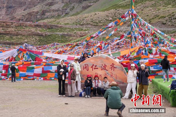 2025年7月21日,游客在岡仁波齊山腳下的經(jīng)幡廣場(chǎng)打卡拍照。岡仁波齊位于西藏阿里地區(qū)普蘭縣境內(nèi),是藏傳佛教的神山之一,每年吸引眾多信徒前往轉(zhuǎn)山。中新社記者 張祥毅 攝