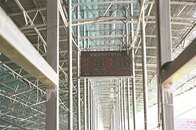 圖為在魯藏高原種子研究院大棚上方懸掛的數(shù)據(jù)屏幕。記者 馬曉艷 扎西頓珠 攝
