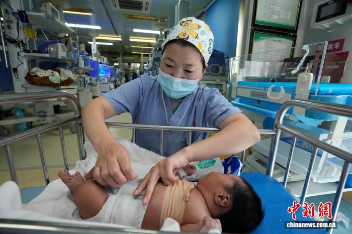 圖為9月5日,西藏阜康醫(yī)院新生兒科內(nèi),護士正在安撫新生兒。李林 攝