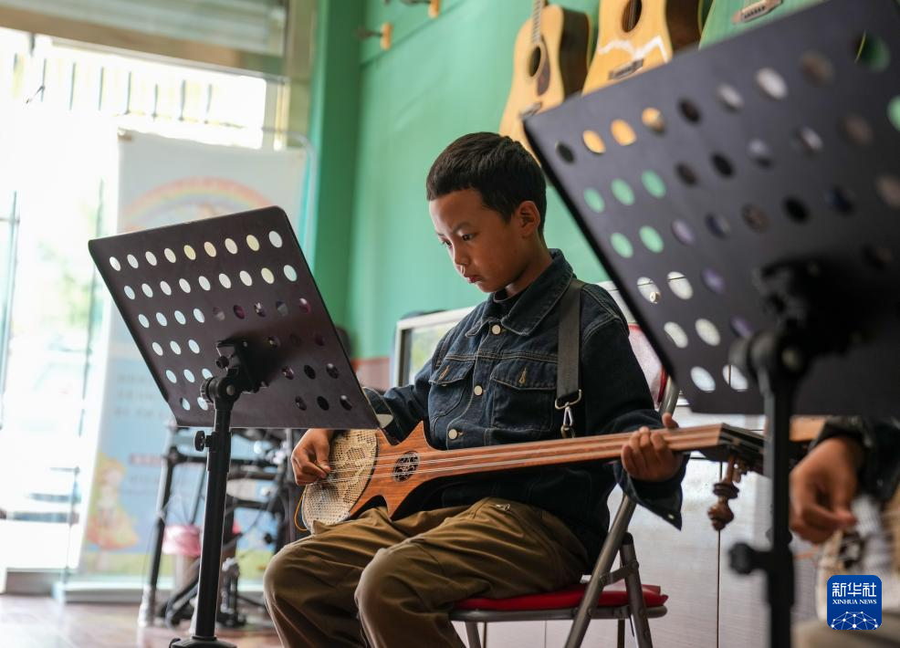9月13日,在拉薩市古樂扎念琴行,桑嘎西熱老師在指導(dǎo)孩子彈奏扎念琴。新華社記者 晉美多吉 攝