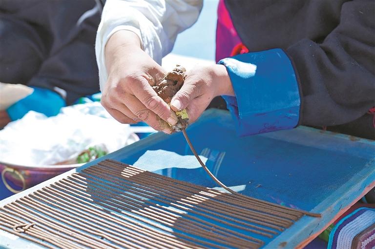 藏香手藝人制作藏香。